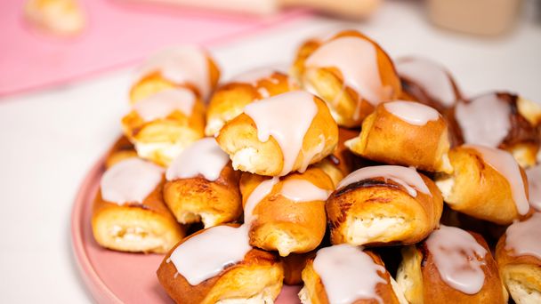 Mięciutkie, drożdżowe poduszeczki wypełnione delikatnym nadzieniem z sera sernikowego, cukru i wanilii – to idealny domowy wypiek na każdą okazję. Ciasto przygotowane z mąki pszennej, mleka, masła, świeżych drożdży i jajka wyrasta przez 2 godziny, a po upieczeniu (15 minut w 180°C) poduszeczki są lekkie, puszyste i pachnące. Na wierzchu – złocista skórka z mleka i domowy lukier. Z jednej porcji wychodzi aż 50 sztuk!