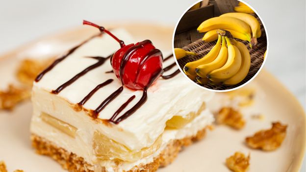 - Jak złożyć deser? Na ciasteczkowym spodzie rozprowadź połowę masy. Następnie ułóż warstwę z bananów i ananasa. Dodaj kolejną warstwę masy i tak przygotowane ciasto bez pieczenia wstaw do lodówki na 3 godziny.