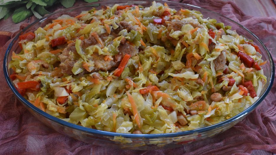 - Cebulę obieramy, drobno kroimy i szklimy na rozgrzanym oleju. Do cebuli dodajemy drobno pokrojoną kapustę oraz obraną i startą na tarce o dużych oczkach marchew i pokrojona w paseczki paprykę.