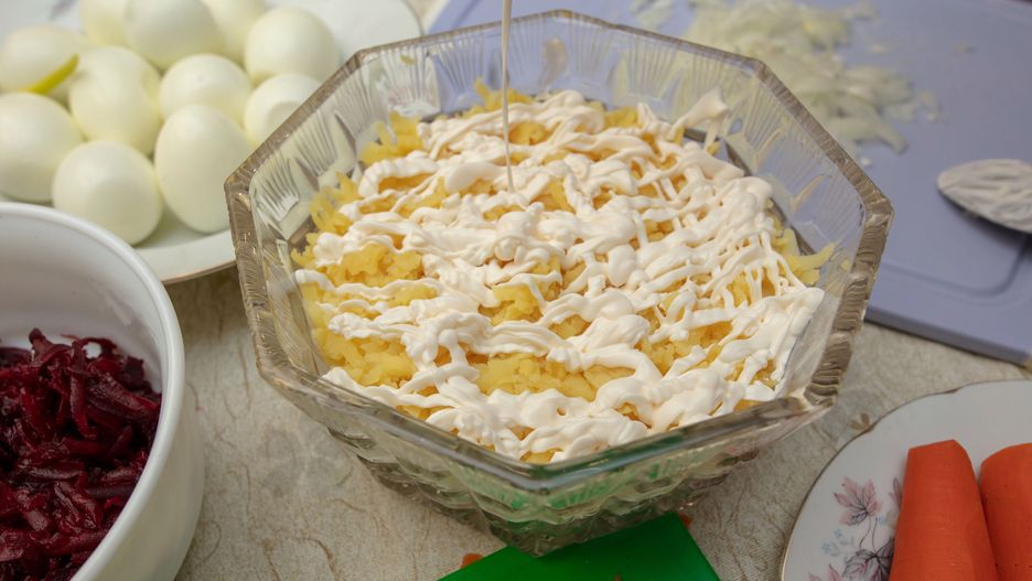 Śledzie kroimy na średniej grubości plasterki i układamy na dnie salaterki, delikatnie smarujemy majonezem, następnie ugotowane jajka drobno posiekane, jako kolejna warstwa - por. Kroimy jak najdrobniej i posypujemy. Następnie majonezem smarujemy wszystko i w ten sam sposób tworzymy kolejne warstwy, później całość zasypujemy startym żółtym serem i posypujemy jednym żółtkiem z jajka, ozdabiamy gałązką natki z pietruszki i danie gotowe.