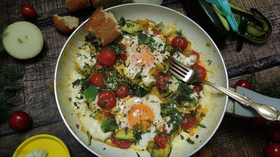 Monika, autorka bloga "Moniki smakołyki", poleca przepis na jajka sadzone z warzywami. Wśród składników znajdziemy cebulę, cukinię, pomidorki koktajlowe. Tak przygotowane jajka to pyszna wariacja na temat słynnej szakszuki.