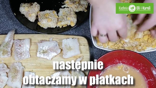 Soczyste kawałki ryby w chrupiącej panierce to świetny pomysł na obiad dla całej rodziny. Zamiast bułki tartej polecamy użyć płatków kukurydzianych. Tak przygotowanego dorsza podajemy z opiekanymi ziemniaczkami lub frytkami i ulubioną surówką. Palce lizać! Zapewniamy, że posmakuje nawet niejadkom. Przepis polecają twórcy filmu: Karolina Adamska, Aleksandra Panak, Michał Stokowski.