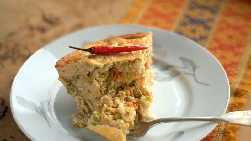 Marchewki obrać, zetrzeć na tarce o dużych oczkach, lub pokroić w julienne. Na patelni rozgrzać masło, wrzucić marchewkę i chwilę przesmażyć. Dodać groszek i mięso. Chwilę przesmażyć, wlać bulion. Doprawić do smaku solą, pieprzem, papryka słodką i ostrą (zamiast papryki można dodać tymianek). Wymieszać z ryżem. Przełożyć do foremki do zapiekania wysmarowanej masłem. Śmietanę wymieszać z jajkami, doprawić solą i pieprzem. Polać nią