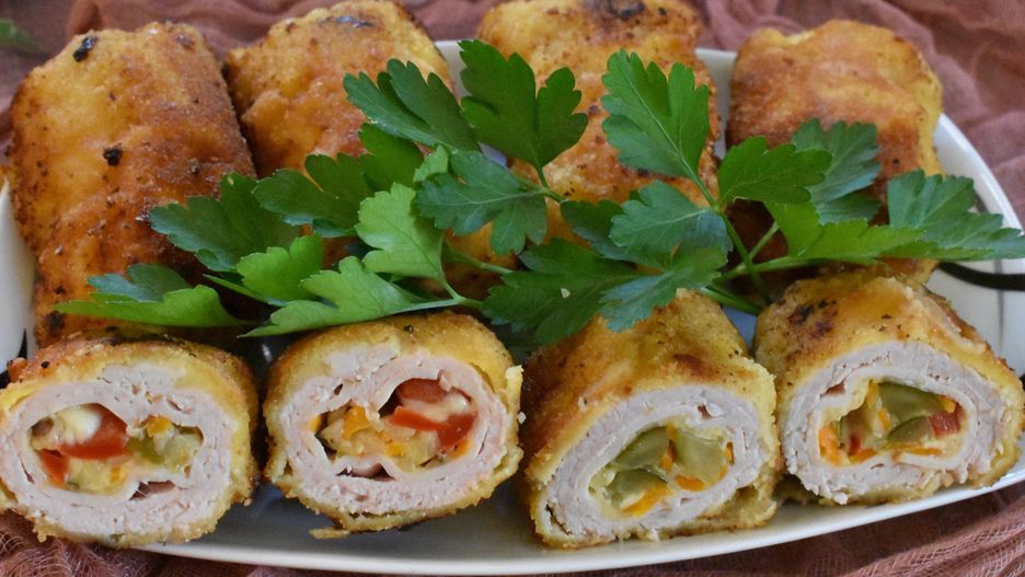 - Na każdym kawałku mięsa układamy po plastrze szynki i po łyżce farszu warzywnego. Mięso zwijamy w roladki, panierujemy w bułce tartej, roztrzepanym widelcem jajku i ponownie w bułce tartej.