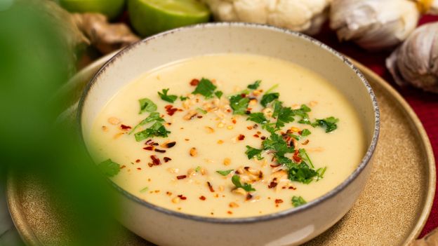 Pyszna, kremowa tajska zupa z kalafiora z dodatkiem imbiru, czosnku, żółtej pasty curry i mleczka kokosowego. Gotowana na bulionie, doprawiona sokiem z limonki, podana z orzeszkami ziemnymi, chili i świeżą kolendrą. Aromatyczna i rozgrzewająca – gotowa w około 30 minut!
