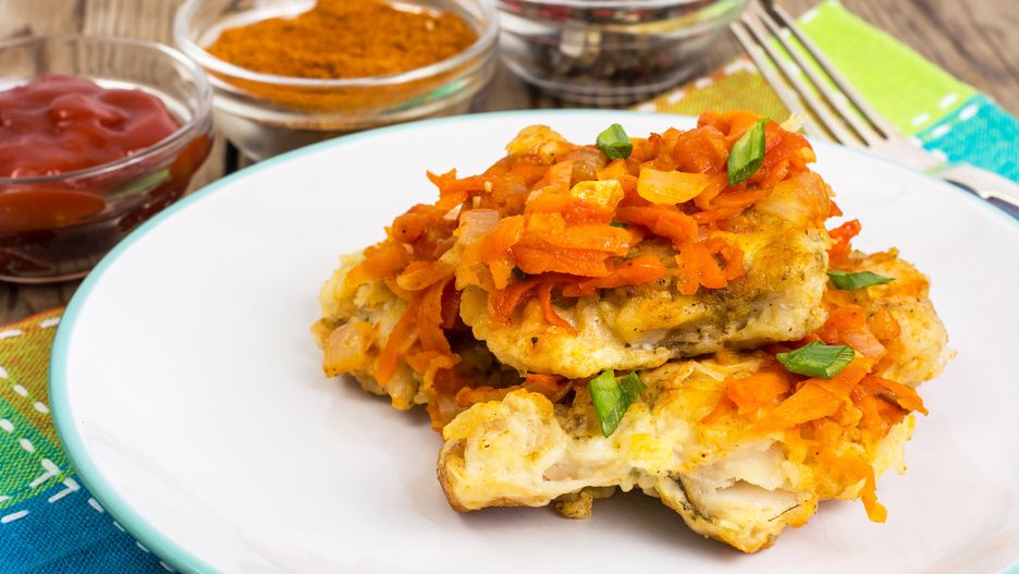 Filet pokroić w kawałki, skropić sokiem z cytryny, oprószyć solą, pieprzem oraz mąką. Następnie usmażyć i przełożyć do półmisek. Wszystkie warzywa obrać, zetrzeć na tarle. Cebulkę oraz paprykę pokroić w kostkę. Smażyć przez chwilkę na oleju i dolać 1-2 łyżki wody. Dodać mały przecier pomidorowy oraz troszkę ketchupu. Przyprawić do smaku cukrem, solą, pieprzem i sokiem z cytryny. Warzywami przykryć rybę. Na warzywa można skroić natkę pietruszki.
