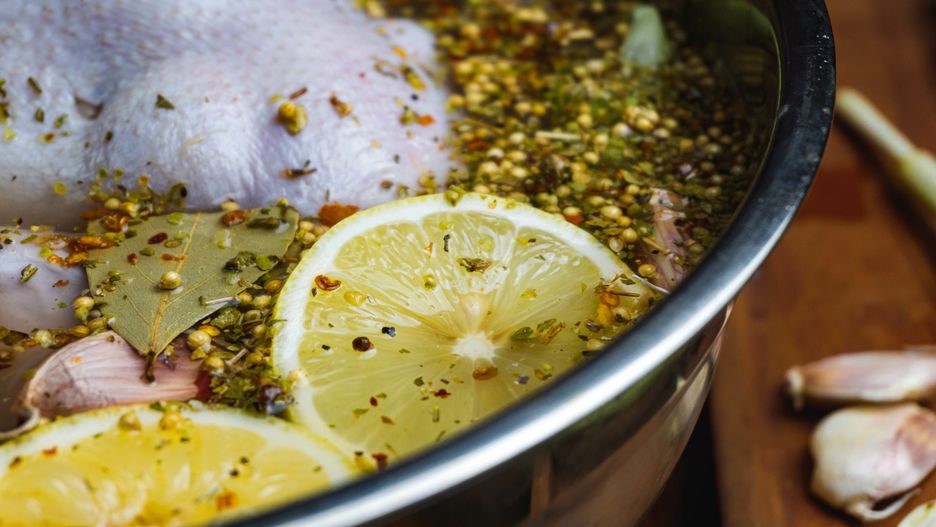 Przygotuj solankę z proporcji: 1 litr wody, 1 łyżka soli, 1 łyżka cukru, sok z jednej cytryny i pomarańczy, czosnek oraz liść laurowy. Mocz kurczaka przez 2 godziny, osusz, natrzyj ziołami i upiecz na złoto.