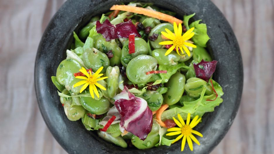 Sałata ze świeżym groszkiem, bobem i liśćmi ogórecznika