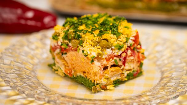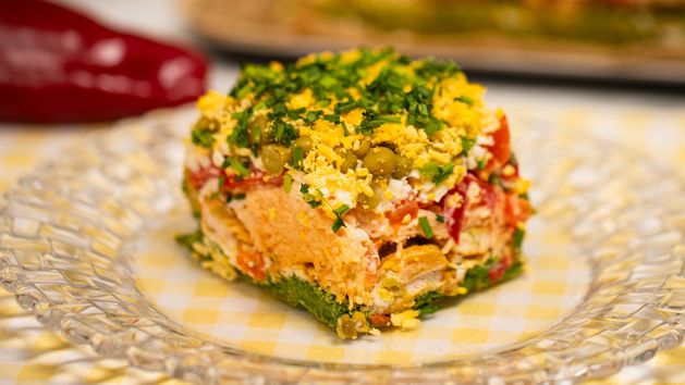 Sałatka tortowa na bazie biszkoptu szpinakowego to prawdziwy hit na święta, imprezy i rodzinne spotkania! Warstwowe połączenie aromatycznego kurczaka gyros, kremowego serka śmietankowego, tartego goudy, jajek, papryki konserwowej i groszku sprawia, że danie nie tylko zachwyca wyglądem, ale też bogactwem smaku. Zielony biszkopt pieczony ze szpinakiem stanowi efektowny i delikatny spód, a całość przypomina elegancki tort w wersji wytrawnej. Sałatka pięknie prezentuje się na stole i znika w mgnieniu oka – zwłaszcza z dodatkiem parmezanu i szczypiorku na wierzchu. Wypróbuj ten przepis i zaskocz gości niebanalną formą tradycyjnych składników!