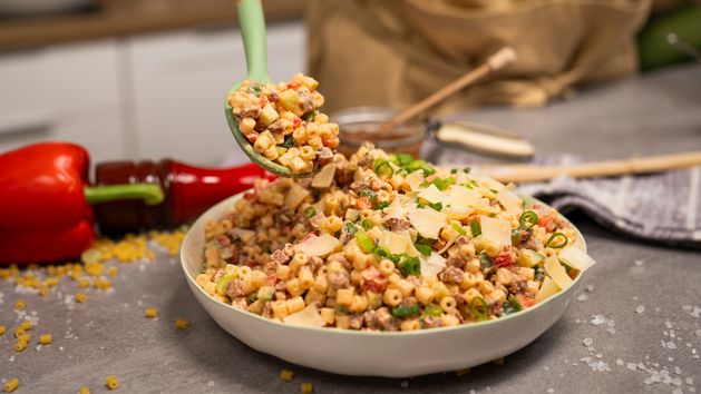 Drobny makaron, soczyste kiełbaski oraz chrupiące warzywa w kolorowym wydaniu mogą stać się bazą pysznej sałatki. Oczywiście w takim przepisie nie może zabraknąć również odpowiedniego dressingu. To w końcu on nadaje całości charakteru. Mieszanka na bazie jogurtu naturalnego i sosu BBQ spisze się w tej roli idealnie. Listę składników znajdziesz poniżej. Natomiast poszczególne etapy przygotowania czekają w naszym wideo.