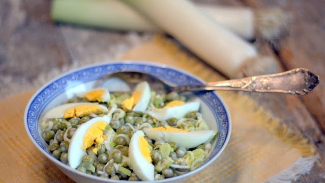 Prosta i szybka sałatka z groszkiem konserwowym, porem i jajkami ugotowanymi na twardo. Doskonale sprawdzi się na kolację. Przepis z bloga "Królestwo Garów".