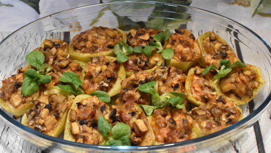 - Farszem napełniasz otwory każdego ziemniaka.