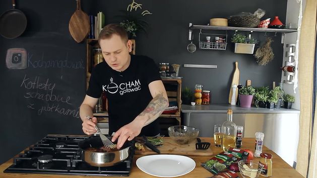 2 kotlety schabowe z kością 1/2 łyżeczki ziela angielskiego 1 laska cynamonu 1 łyżka majeranku sól morska pieprz czarny 2 duże łyżki oleju 1 jabłko 1 czerwona cebula 150 ml cydru 1 łyżeczka musztardy sarepskiej 1 łyżka masła szałwia tymianek