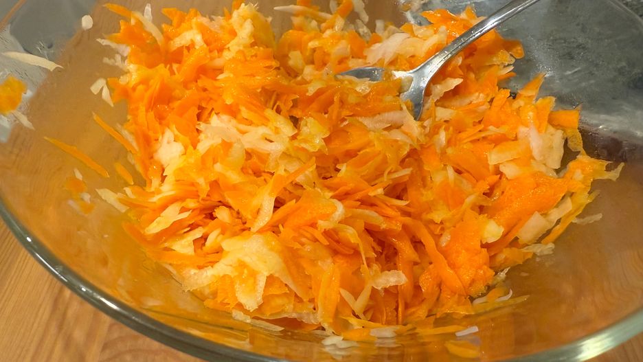 - Zetrzyj warzywa na dużych oczkach tarki i przełóż do miski.