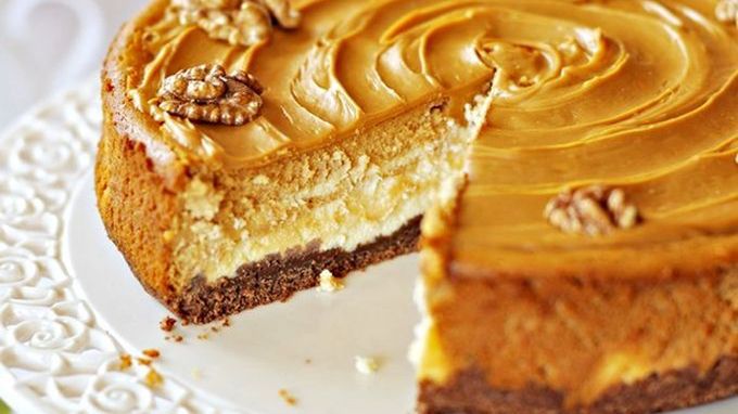 - Czekoladę połamać i razem z masą krówkową, która została w puszcze, roztopić na parze. Polewą udekorować wierzch sernika i poukładać orzechy włoskie.