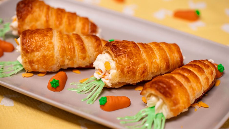Wystarczy ciasto francuskie i pyszny krem do środka - u nas mascarpone ze słodką śmietanką ubite na sztywno. Dekoracje też są jadalne, co czyni ten deser dosłownie bajecznie smacznym. Ciasto francuskie piecz przez 15-20 minut (do zarumienienia) w 200 stopniach C. Możesz użyć foremek do rurek lub zwiniętej folii aluminiowej, aby uzyskać kształt marchewek.