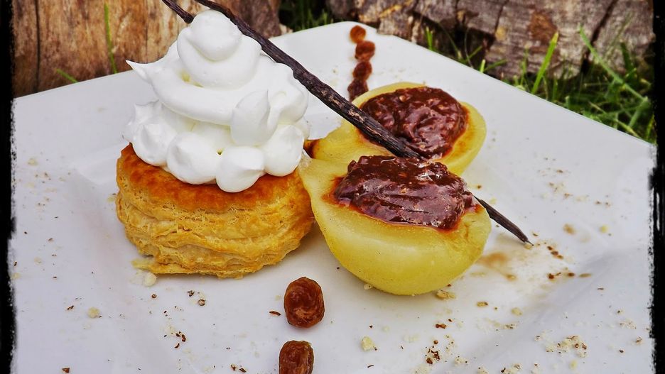 - Na talerzu połóż po dwie połówki gruszki, jeden krążek (wystudzony) z ciasta francuskiego, na który dodaj bitą śmietanę. Całość ozdób laską wanilii, rodzynkami i mielonymi migdałami.