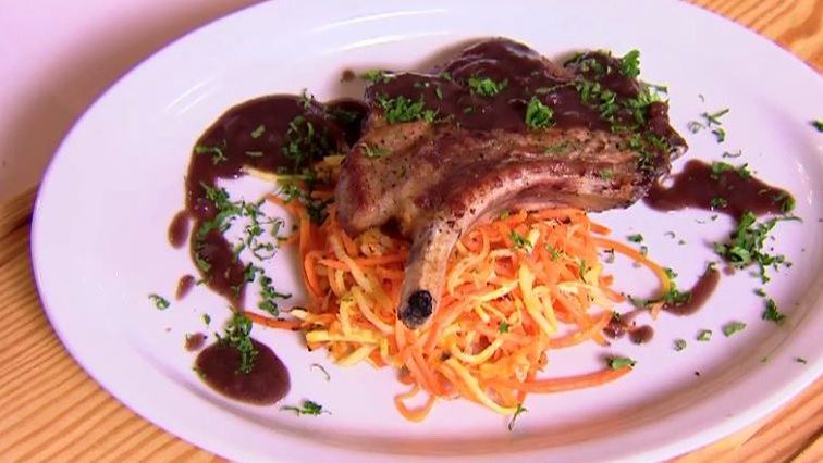 Spaghetti z marchewki i stek wieprzowy z sosem z czarnego bzu