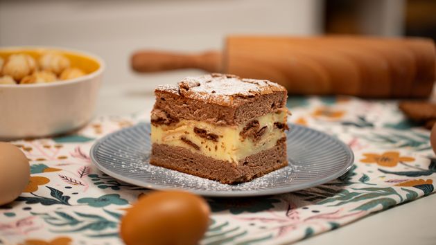 - Jak złożyć domowy wypiek Zygzak? Ciasto z kakao podziel na pół. Połowę ułóż na spodzie. Następnie dodaj krem budyniowy z herbatnikami i ponownie przykryj ciastem.