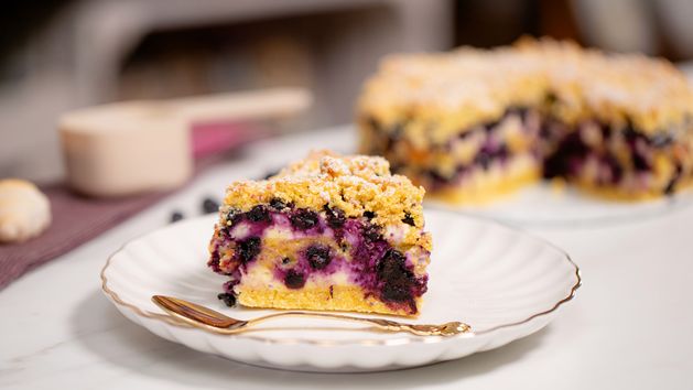 Sypany sernik jagodowy bez mąki pszennej. Zrób raz, a rodzina zakocha się w tym smaku