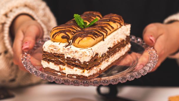 - Jak złożyć ciasto? Na spodzie formy zabezpieczonej papierem do pieczenia, ułóż spód z kakaowych herbatników. Na ciasteczkach rozprowadź połowę kremu, po czym przykryj go kolejnym poziomem herbatników.
