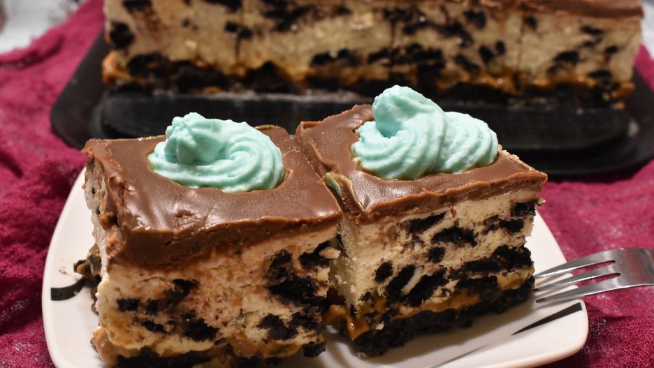 - Połowę ciastek bardzo drobno kruszymy, łączymy z rozpuszczonym masłem i wykładamy na dnie tortownicy o wymiarach 24 cm X 24 cm