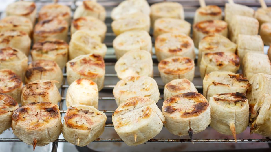 - Wymieszaj cukier z cynamonem w miseczce, obtocz banany, umieść na tackach grillowych posmarowanych olejem i ułóż na rozgrzanym grillu.