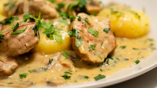 - Gotowe danie podawaj z ulubionymi dodatkami. Świetnie sprawdzą się tu kluski śląskie, ziemniaki, ryż, kasza, kopytka, a nawet makaron.