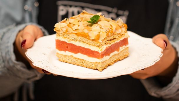 - Jak złożyć deser? Na spodzie ma znaleźć się jeden upieczony blat ciasta. Nasącz go herbatą. Następnie zrób warstwy z masy budyniowej, musu jabłkowego i kolejnej porcji masy. Na wierzchu ułóż drugi blat. Nie zapomnij o herbacie. Bezpośrednio na cieście rozprowadź masę krówkową i posyp je migdałami w płatkach.