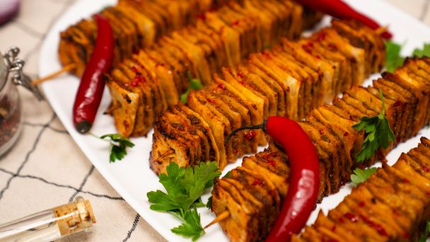 Tortillowe szaszłyki z mieloną wołowiną i kolorowymi warzywami to pomysł na efektowne, a jednocześnie proste danie z piekarnika. W środku znajdziesz soczyste mięso z dodatkiem czosnku, natki pietruszki i przecieru pomidorowego, doprawione słodką papryką i zawinięte w pszenne tortille. Pokrojone na kawałki i nadziane na patyczki tworzą apetyczną przekąskę, która po upieczeniu staje się złocista i aromatyczna. To świetna propozycja na imprezę, rodzinny obiad albo kolację z twistem – łatwe do przygotowania, wygodne do jedzenia i pełne wyrazistych smaków.