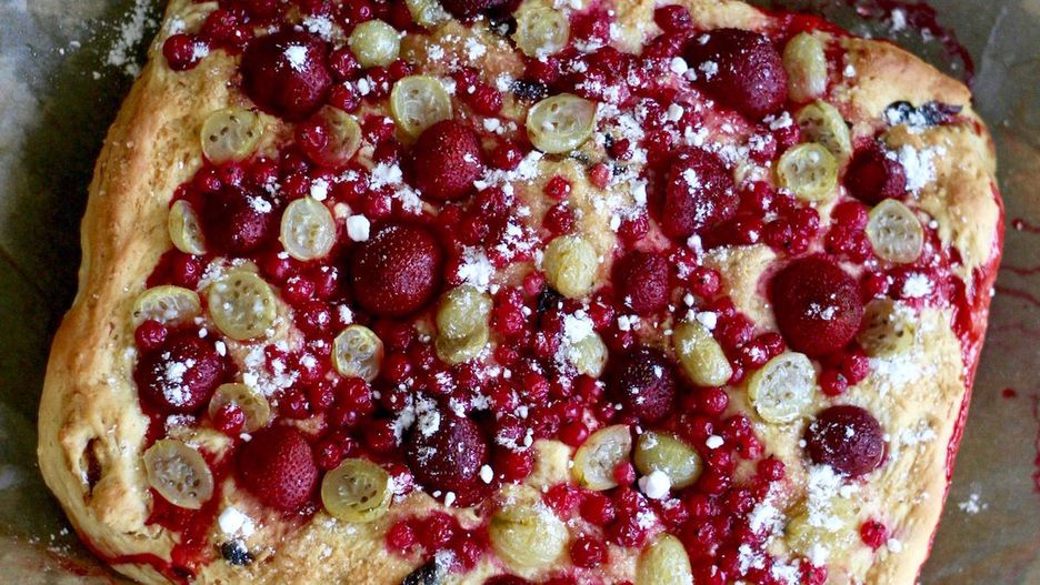 Najpierw rozpuszczam w ciepłym mleku drożdże. Przesiewam mąkę, dodaję resztę mleka i wlewam rozpuszczone drożdże (nie czekam, aż napęcznieją). Dodaję też cukier, szczyptę soli, żółtka i białka ubite na sztywną pianę. Wszystkie składniki dobrze mieszam i zaczynam wyrabiać ciasto, aby było jednolite. Pod koniec dodaję rozpuszczone masło, rodzynki i startą gałkę muszkatołową. Wyrabiam ciasto, jeżeli nie odchodzi od ręki, to znaczy, że trzeba dosypać jeszcze odrobinę mąki. Zostawiam ciasto do wyrośnięcia na mniej więcej 45 minut. Wyrośnięte ciasto wykładam na blaszkę wyłożoną papierem do pieczenia. Formuję kwadratowy placek i rozpłaszczam ciasto. Pamiętajmy, że ciasto drożdżowe jeszcze podrośnie. Wykładam na ciasto wybrane owoce, u mnie są to: agrest, czerwona porzeczka, czarna porzeczka, kilka truskawek. Zostawiam ciasto na kolejne 20 minut. Ciasto wstawiam do piekarnika z ustawieniem grzanie góra-dół, 160 stopni. Placek drożdżowy piecze się przez ok. 35 minut.