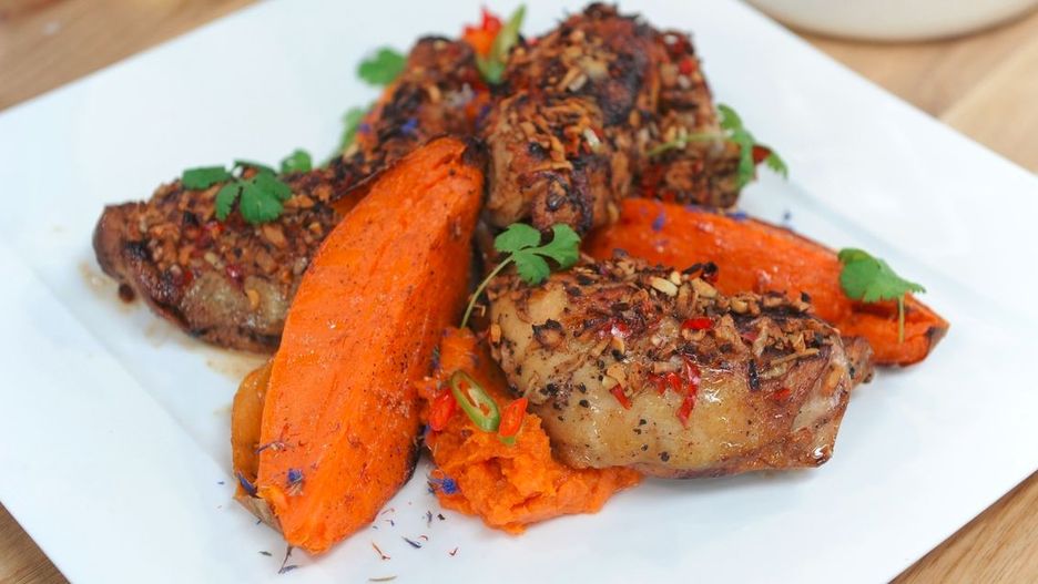 Wymieszać wszystkie składniki marynaty i zalać nią kurczaka. Zostawić co najmniej na kilka godzin, a najlepiej na całą noc w lodówce. Następnego dnia, oczyścić mięso z marynaty – nie wylewać jej. Rozgrzać piekarnik do 170 st. C. Kurczaka obsmażać partiami na rozgrzanym oleju kokosowym. Cukier powoduje, że mięso szybko się karmelizuje. Przełożyć do brytfanki, zalać pozostałą marynatą i piec ok. 45 min., aż mięso będzie miękkie. Podawać z pieczonym batatem.