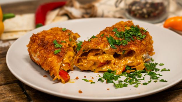 - Każdą taką konstrukcję obtocz w panierce z płatków kukurydzianych. Pamiętaj, że wcześniej musisz delikatnie je rozbić, aby bez problemu przywierały do tortilli. Najłatwiej przygotujesz je przy pomocy worka z suwakiem i wałka do ciasta.