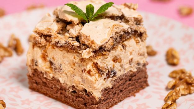 - Jak złożyć ciasto? Na upieczonym biszkopcie rozprowadź masę, po czym umieść na wierzchu chrupiącą bezę.