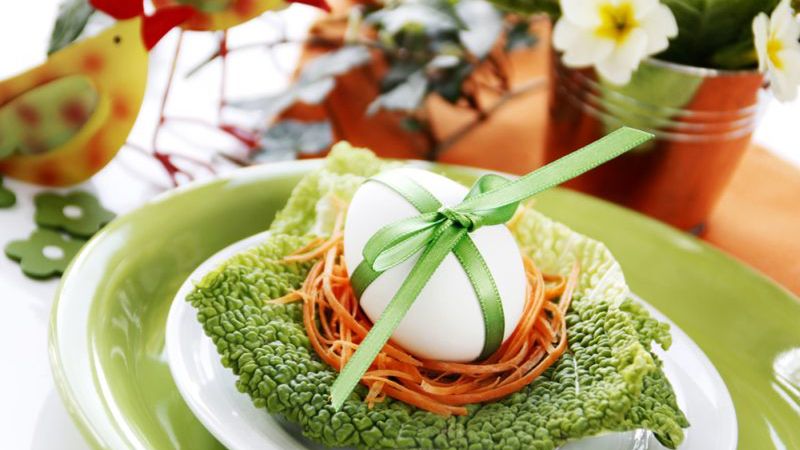 Zielone listki prezentują się ładnie nie tylko w wazonie, ale również na talerzu. Dodatek małych pisanek z przepiórczych jaj lub jajeczek czekoladowych tylko wzbogaci cały efekt.