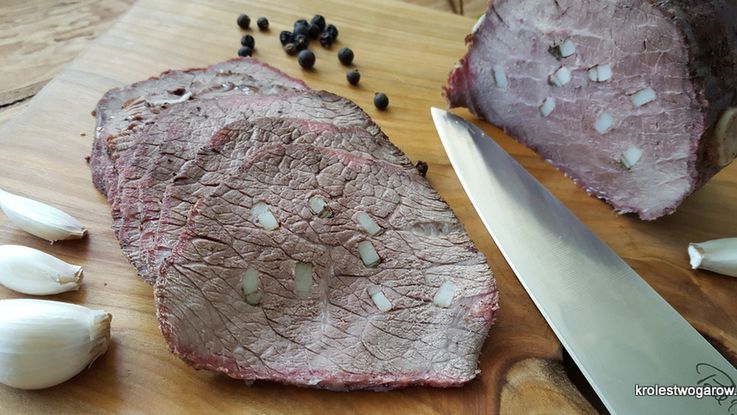 - Wędlinę przygotowałam w szynkowarze, urządzeniu do przygotowywania domowych wędlin, dużo lepszych niż sklepowe i na pewno dużo zdrowszych – bez tłuszczu i smażenia - przekonuje Joanna, autorka bloga "Królestwo Garów". Tak przygotowane mięso smakuje zarówno na ciepło jak i na zimno.