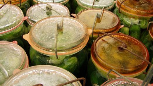 Przygotowując przetwory z ogórków zawsze należy je dokładnie umyć, przebrać i sprawdzić czy nie są obite, nadgniłe lub uszkodzone. Po przeprowadzonej selekcji ogórki układamy w słoiku, przekładając je koprem, czosnkiem, chrzanem, liśćmi porzeczki, wsypujemy ziarna ziela angielskiego i pieprzu. Ogórki zalewamy gorącą wodą z dodatkiem z łyżeczki soli. Sprawdzamy, czy wierzchnia część otworu słoja nie jest mokra, jeśli tak przecieramy ściereczką i zamykamy mocno suchą nakrętką. Odwracamy słoik do góry dnem i pasteryzujemy przez 20 minut w nagrzanym piekarniku.