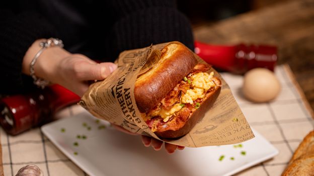 - My tym razem postawiliśmy na bekon, kremową jajecznicę, sos, żółty ser i świeży szczypiorek.