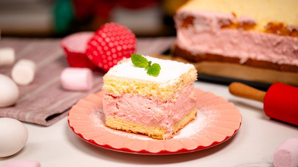 Ciasto Truskawkowa Pianka to lekki deser, który zachwyci każdego miłośnika owocowych smaków. Puszysty biszkopt z 6 jajek pieczony przez 35 minut w formie o wymiarach 28 × 18 cm stanowi doskonałą bazę dla delikatnej pianki z mrożonych truskawek, bitej śmietany i galaretek truskawkowych. Całość schładza się w lodówce przez minimum 4 godziny, by uzyskać idealną konsystencję i świeżość. To szybkie i efektowne ciasto bez żelatyny, które idealnie sprawdzi się na przyjęcia, grille i rodzinne spotkania - latem możesz użyć świeżyć truskawek.