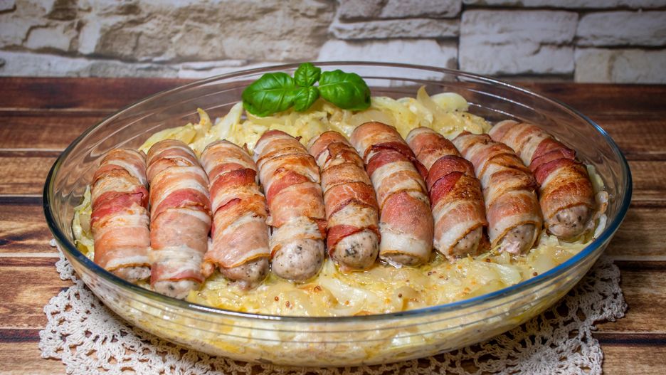 Zapiekane białe kiełbasy z kapustą