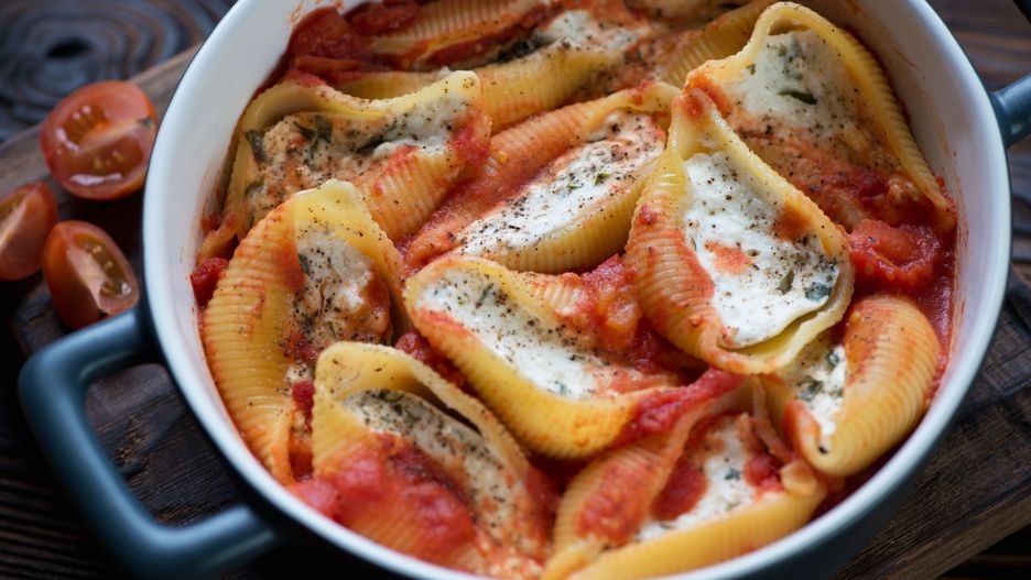 - Makaronowe muszle nadziewamy grzybowym farszem. Układamy je w naczyniu żaroodpornym, zalewamy sosem pomidorowym. Wkładamy do piekarnika i pieczemy około 25 min w temp. 180 st. C. P