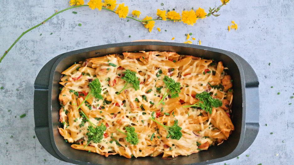 Z kilku podstawowych składników możesz wyczarować coś smakowitego na obiad. Bazą jest makaron penne. Dołóż kurczaka w przyprawie gyros, warzywa konserwowe lub świeże, ser, łatwy sos i gotowe. Przepis na tę pyszną i sycącą zapiekankę poleca Wiola, autorka bloga "Gotuj i mieszkaj".