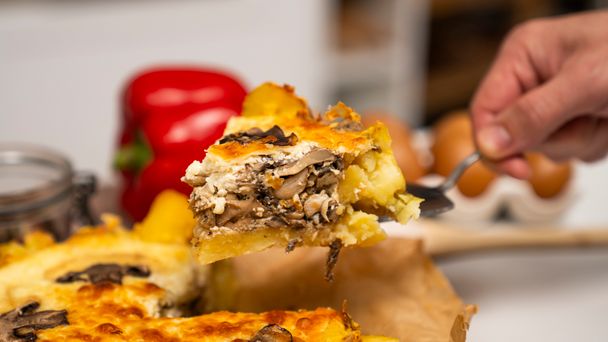 Ziemniaczana babka z kurczakiem i pieczarkami. Pomysł na obiad prosto z piekarnika