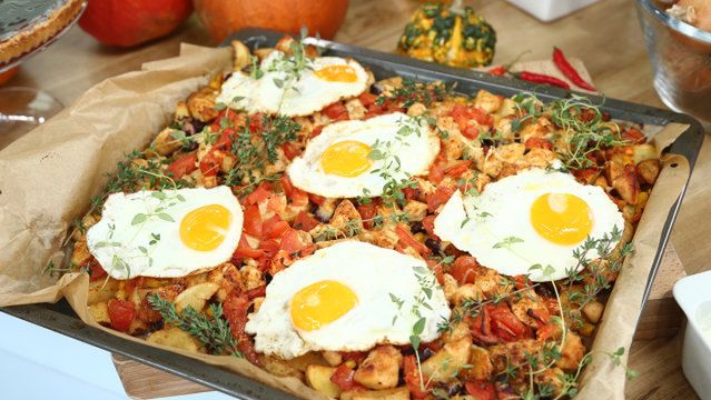 Ziemniaki doprawiamy przyprawą meksykańską i chilli, po czym odstawiamy. Pierś z kurczaka kroimy w średniej wielkości kostkę, doprawiamy. Na rozgrzaną patelnię z niewielką ilością oleju wrzucamy pokrojoną cebulę, smażymy. Dodajemy pierś z kurczaka. Wszystko parę minut podsmażamy i odkładamy do miski. Na tej samej patelni podsmażamy pieczarki. Gotowe łączymy z ziemniakami i kurczakiem z cebulą, dodajemy kukurydzę i odsączoną fasolę. Wszystko rozkładamy na papierze pergaminowym na dużej blaszce. Posypujemy startym serem, a na wierzchu układamy pomidory pokrojone w kostkę. Pieczemy około 30 min., aż wszystkie składniki będą rumiane. Smażymy jajka sadzone i układamy je na zapiekance. Wszystko posypujemy ulubionymi ziołami.